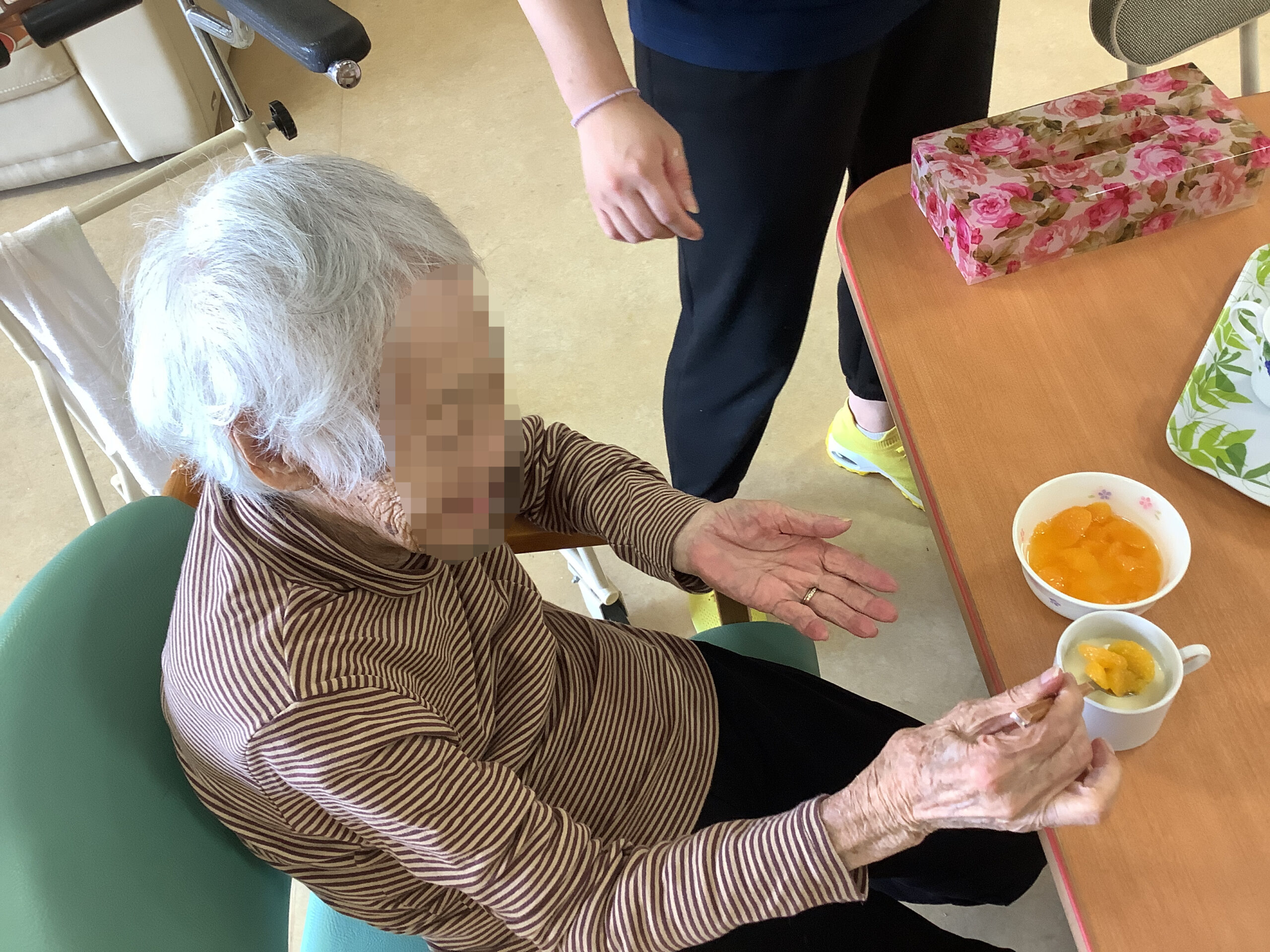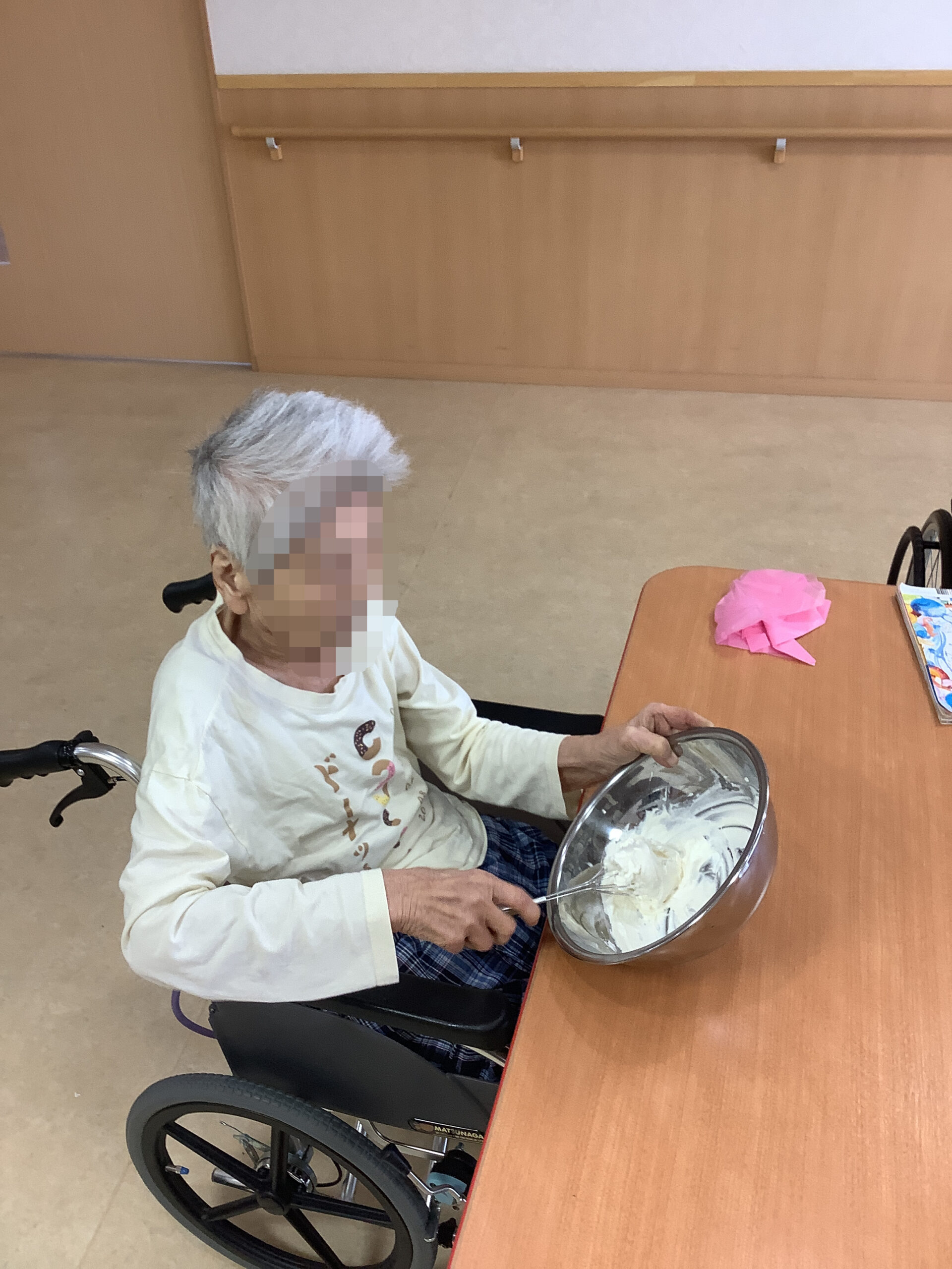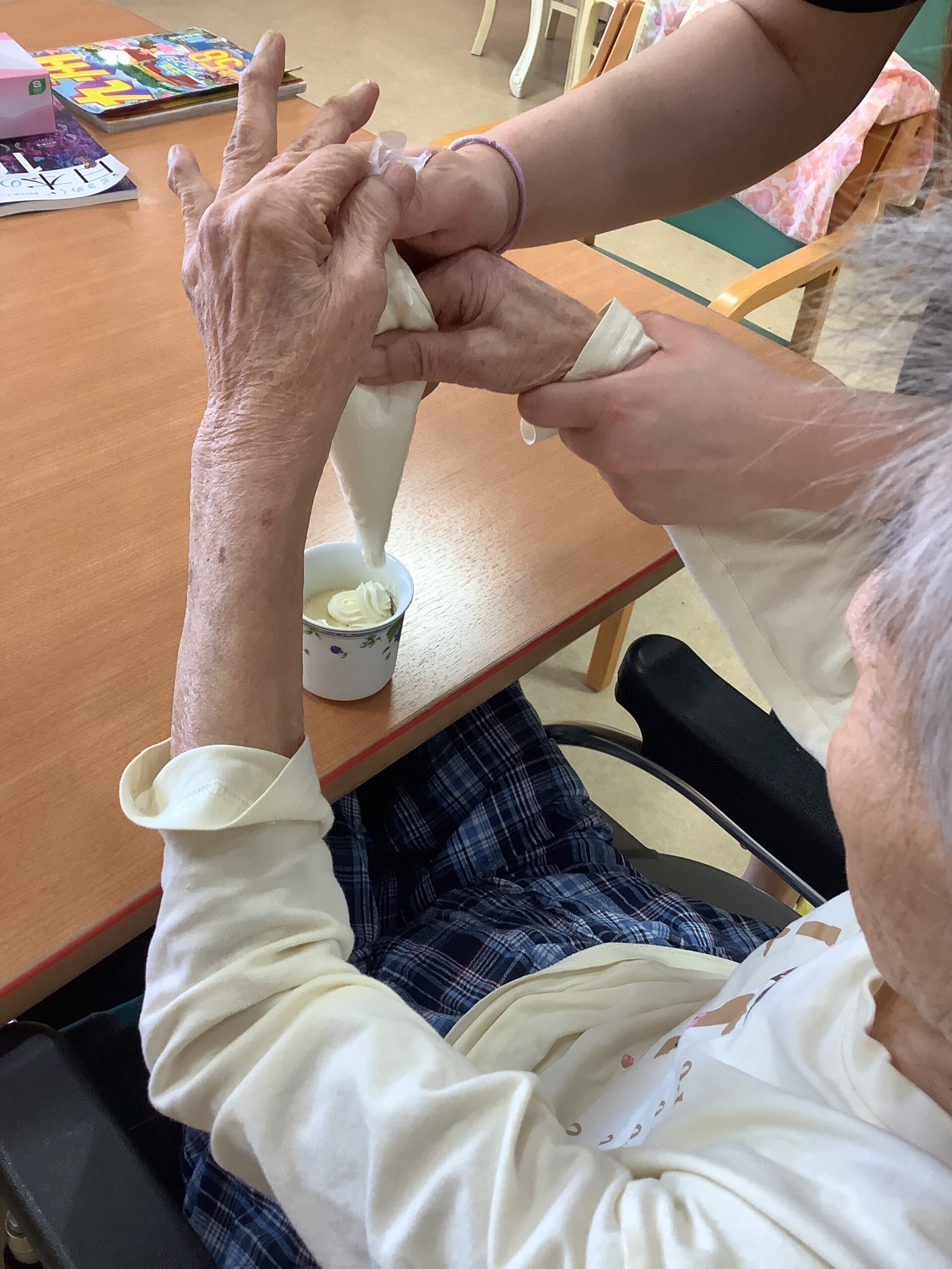 入居者様と一緒におやつのプリン作りをしました。ホイップクリームを泡立てたり、絞り出したり、フルーツのトッピングを楽しんでいただきました。ご自分でトッピングをしたプリンが嬉しかったようで、皆さま、笑顔で召し上がっていました。いつもは職員の介助で食事をされている入居者様も、ご自分でスプーンを持って意欲的に口まで運んでおられて、面会のご家族様も驚いておられました。