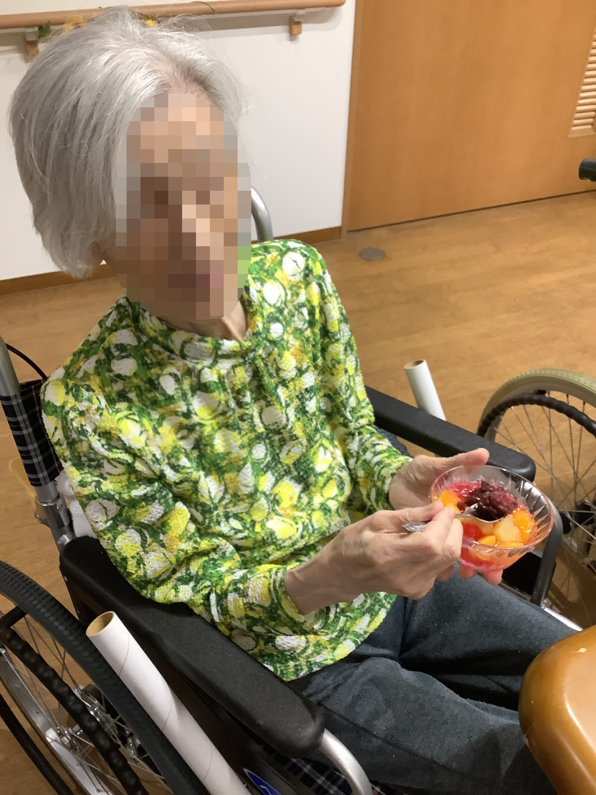 かき氷機を使って、入居者様にも実際にハンドルを回していただき、ふわふわの氷を作っていただきました。出来上がった氷には、いちご・メロン・ブルーハワイの3種類のシロップをご用意し、お好みの味を選んでいただきました。さらに、果物や小豆などもお好みでトッピングしていただき、色とりどりで華やかなかき氷が出来上がりました。