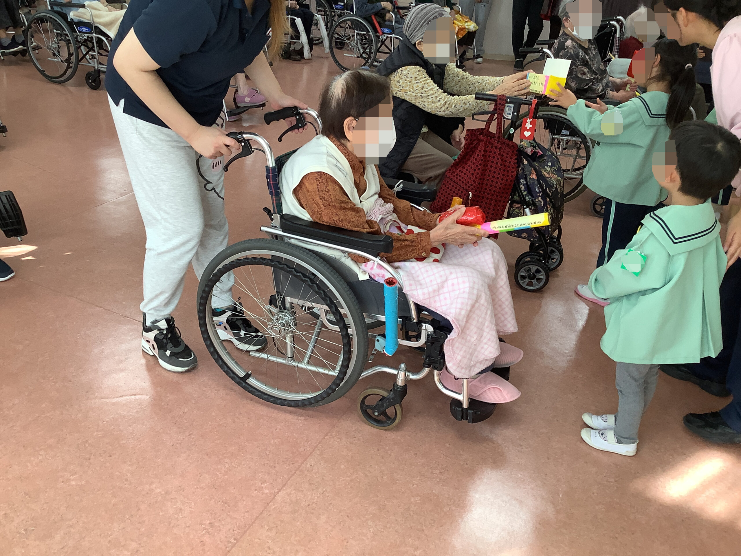 入居者の皆さまは、子どもたちの姿を見ると表情がふっと柔らかくなり、「かわいいねぇ」「よく来てくれたね」と嬉しそうに声をかけていました。