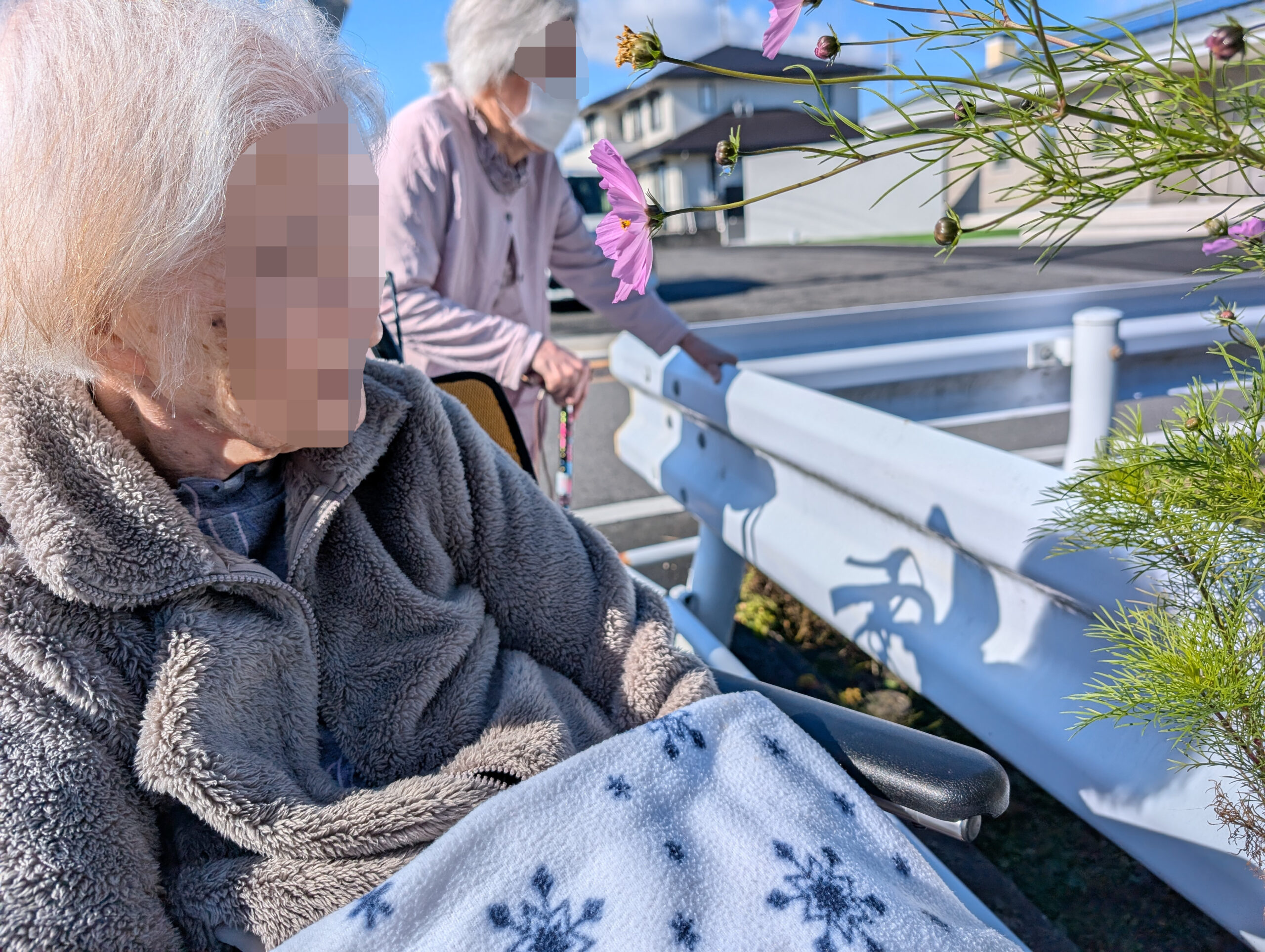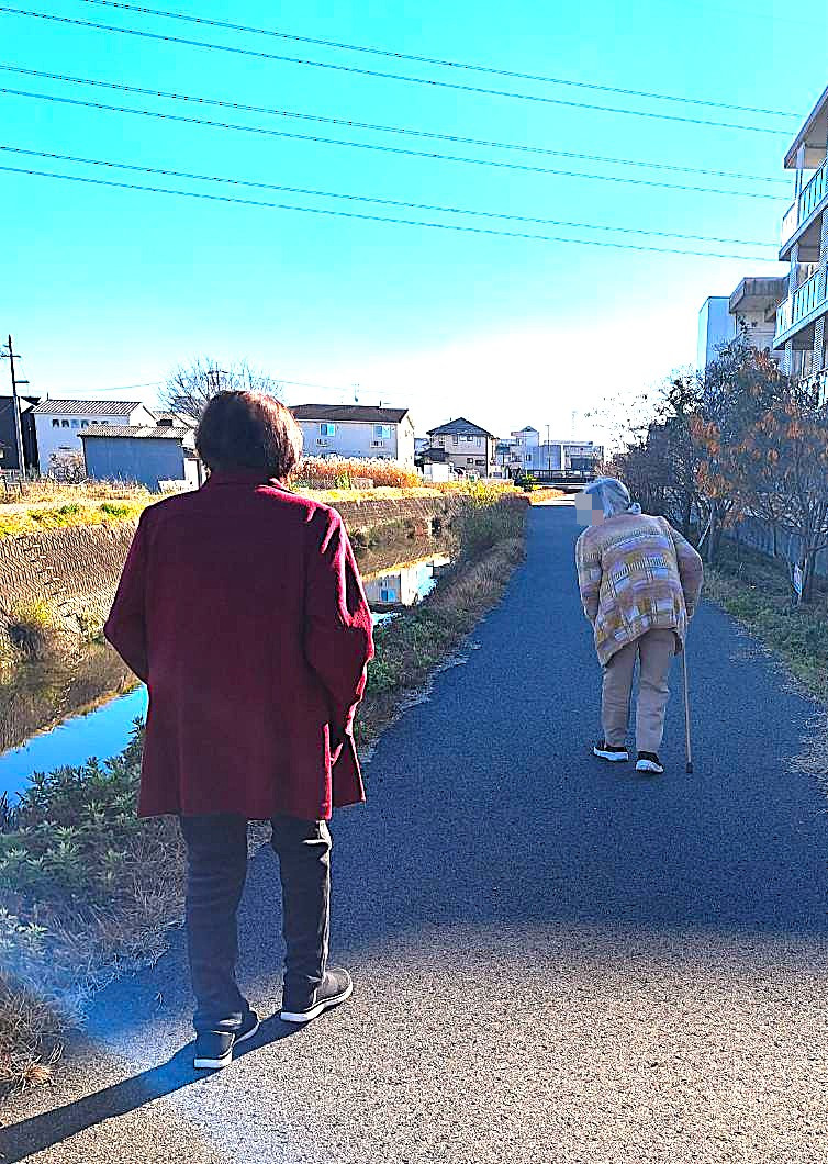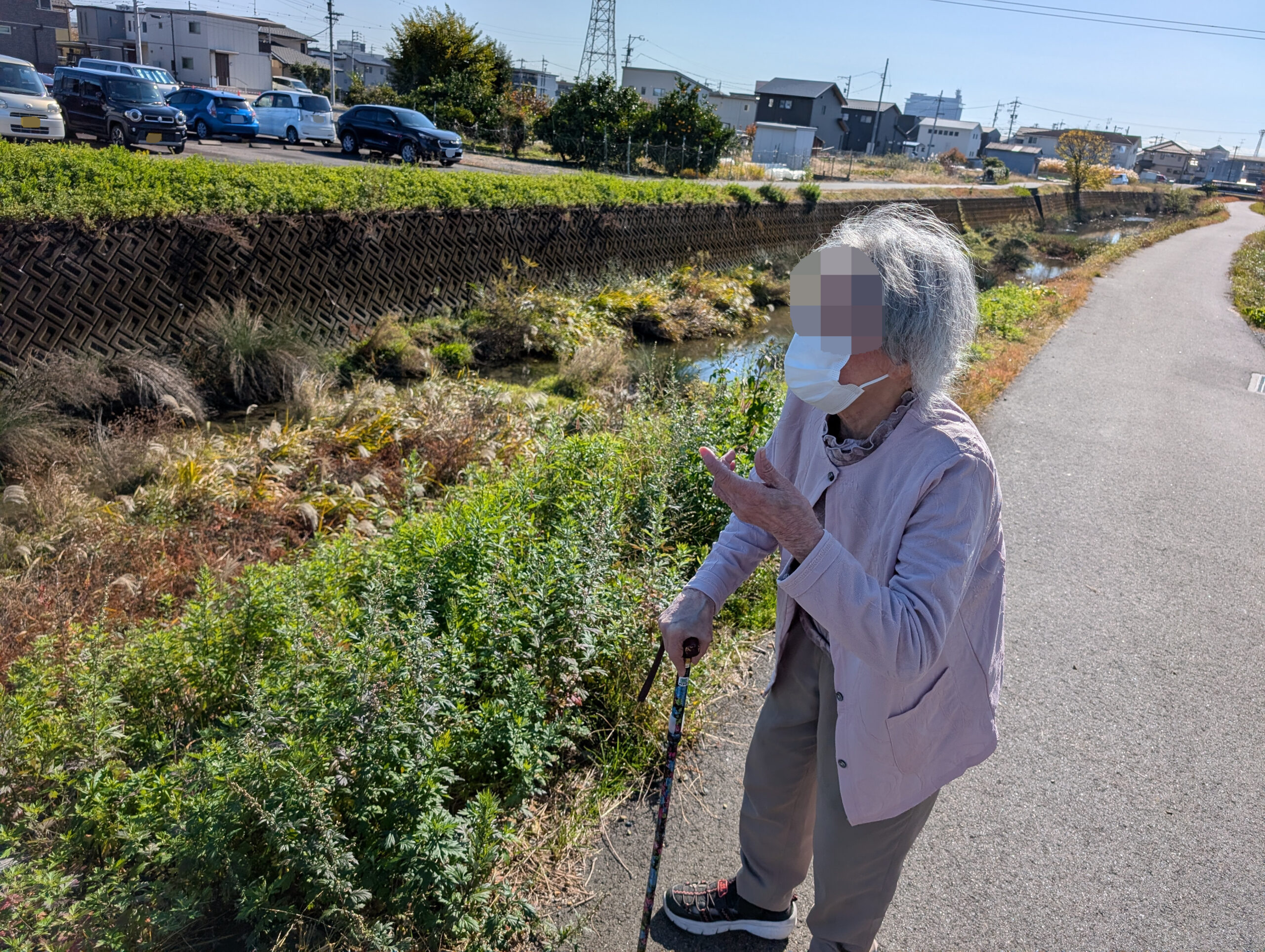 デイサービスでは歩行訓練と気分転換をも兼ねて、施設横の論田川の川沿いを歩いています。