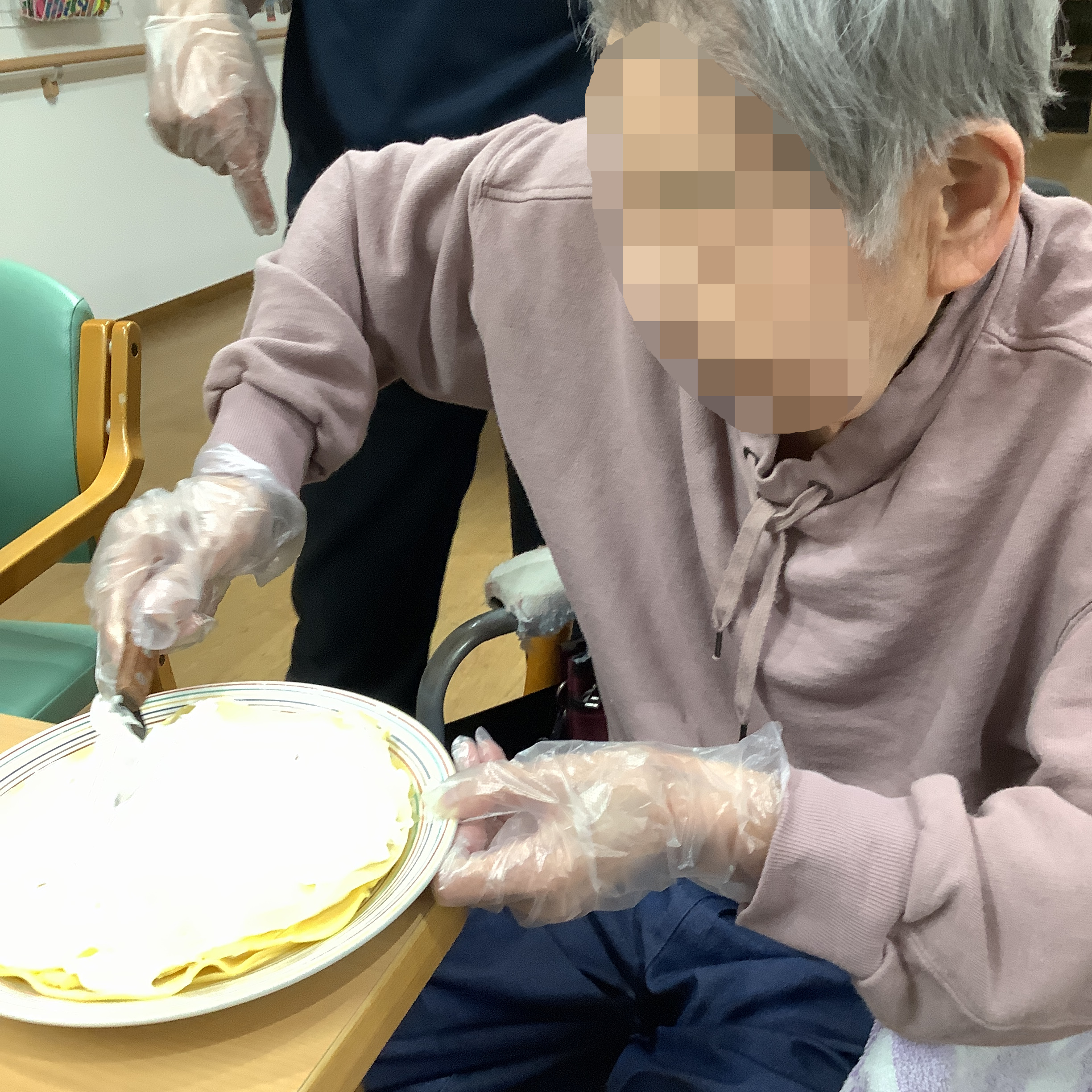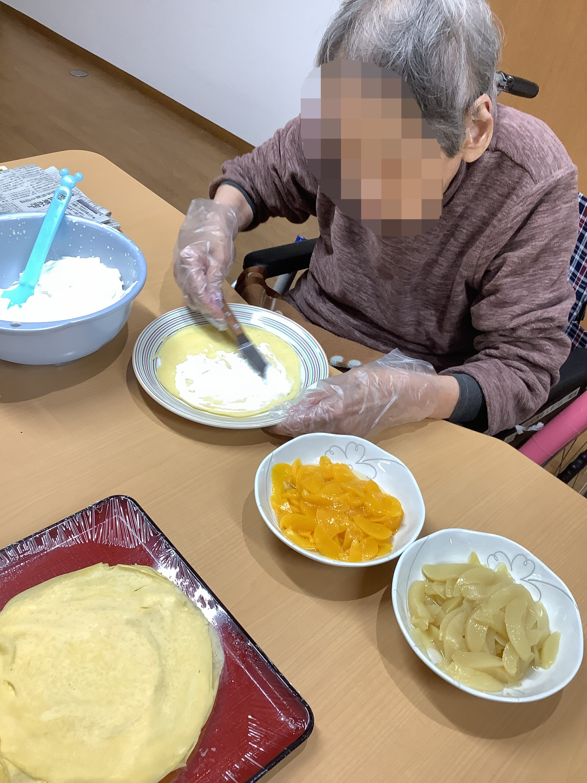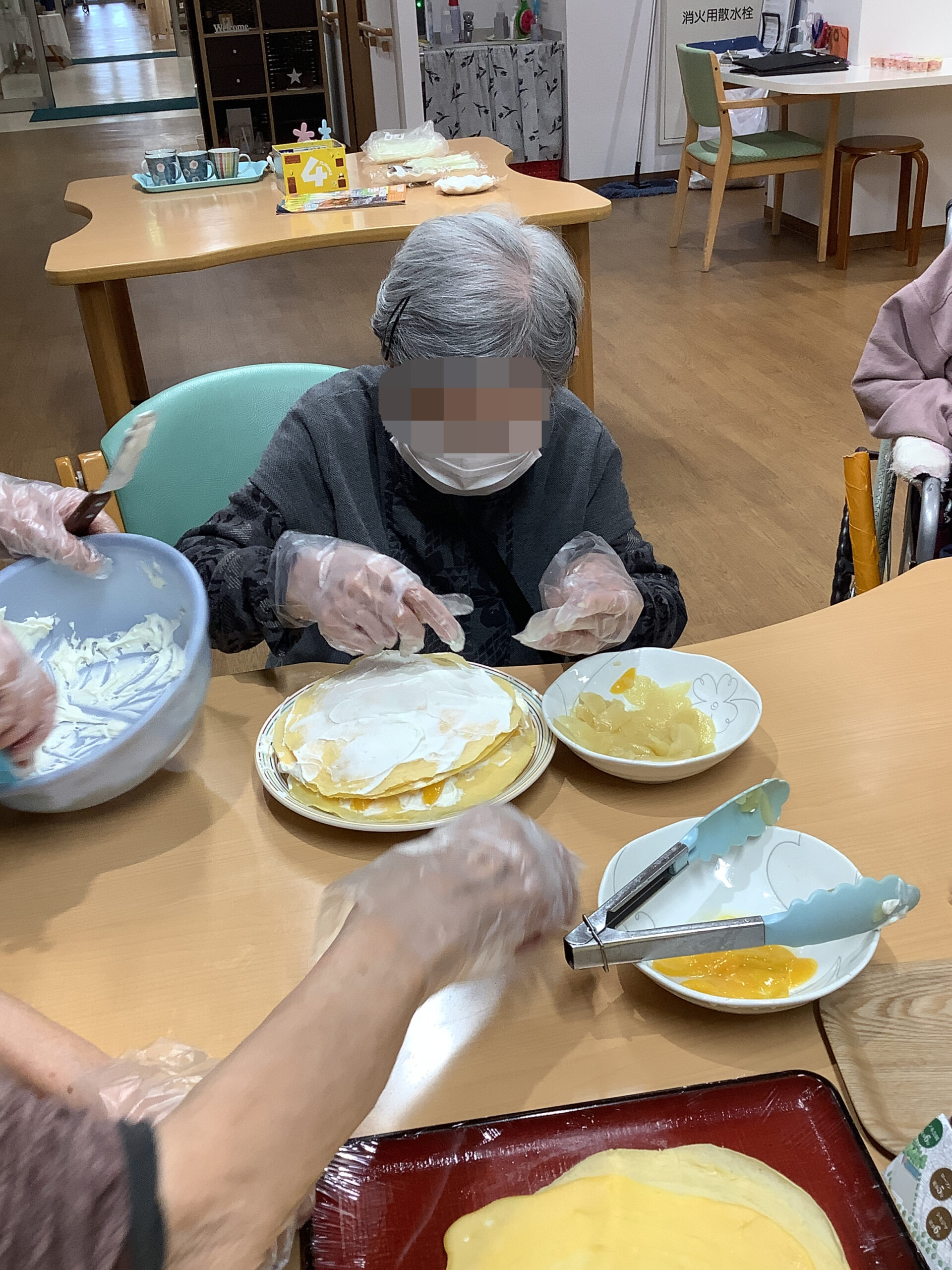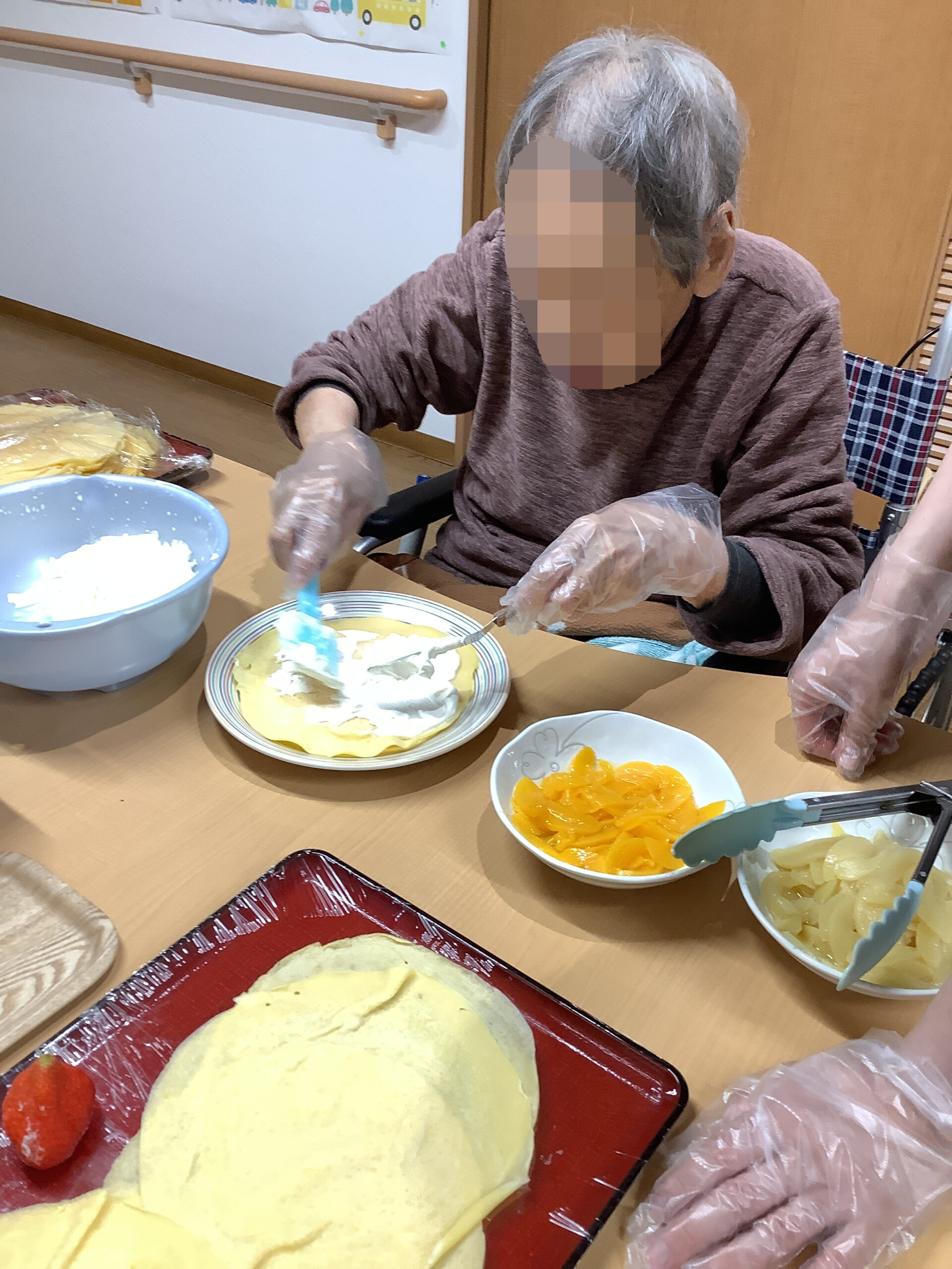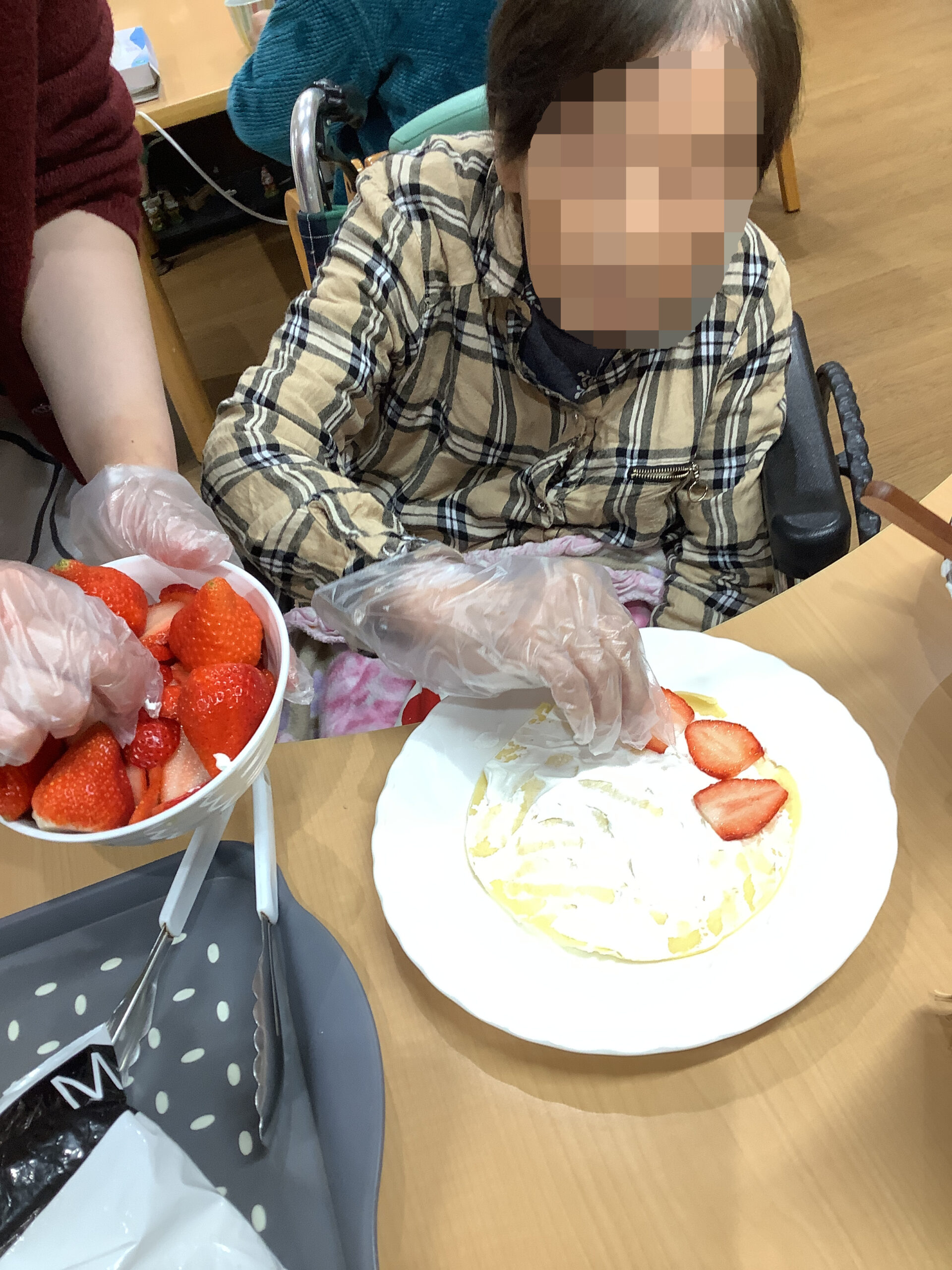 出来上がったものを食べながら「やっぱり自分達で作ったおやつは美味しいね」「こんなに苺が沢山で贅沢ね」と入居者様同士で感想を言い合っていらっしゃいました。