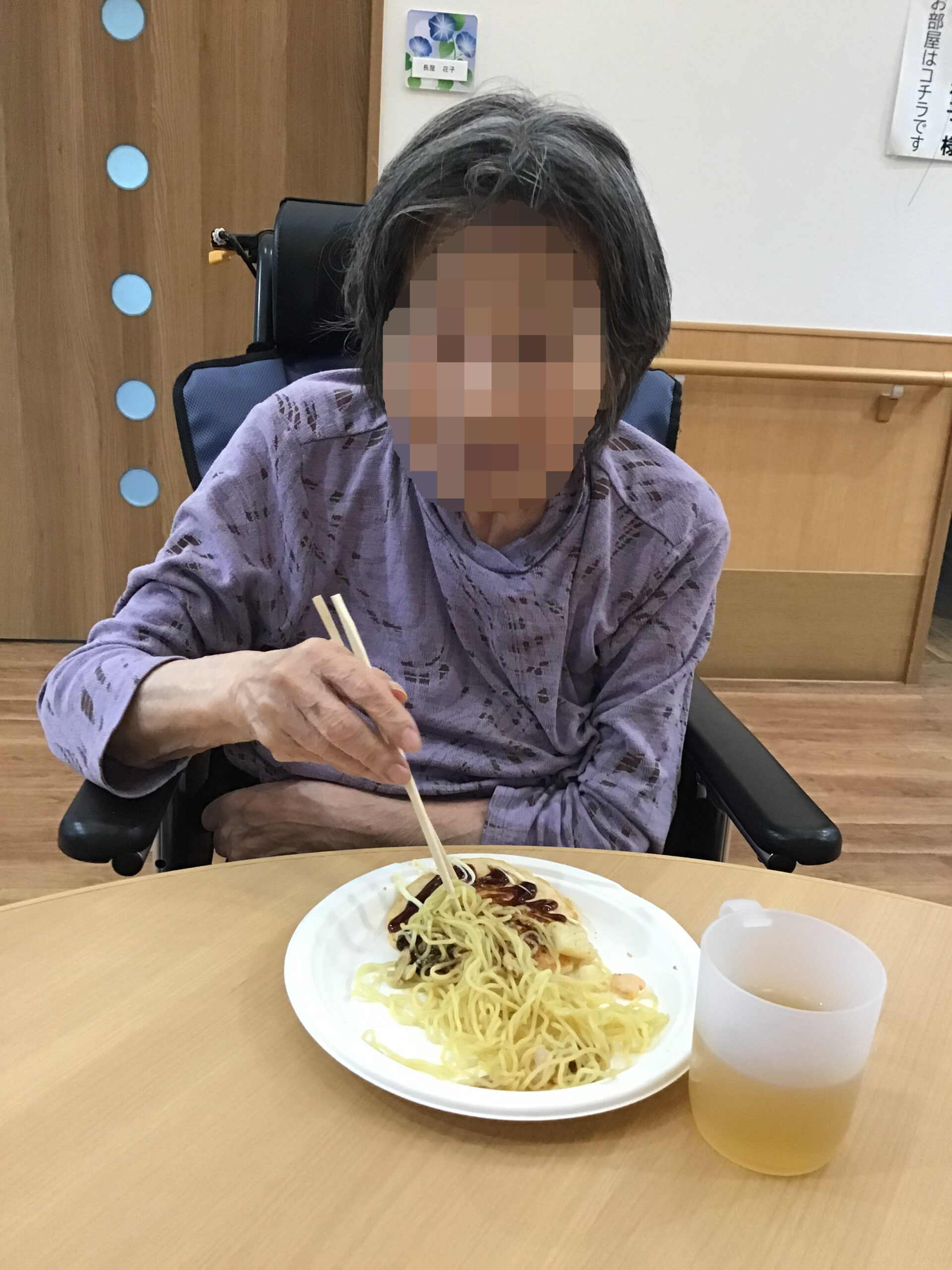 今月のおやつ作りはお好み焼きとシーフード塩焼きそばを作りました。入居者様にホットプレートの上に生地を流したり、焼きそばを混ぜたりしていただきました。出来上がり、マヨネーズやソースをお好みでかけて食べていました。ほとんどの方が完食され、「次もこれがいい」と言う方もいました。
