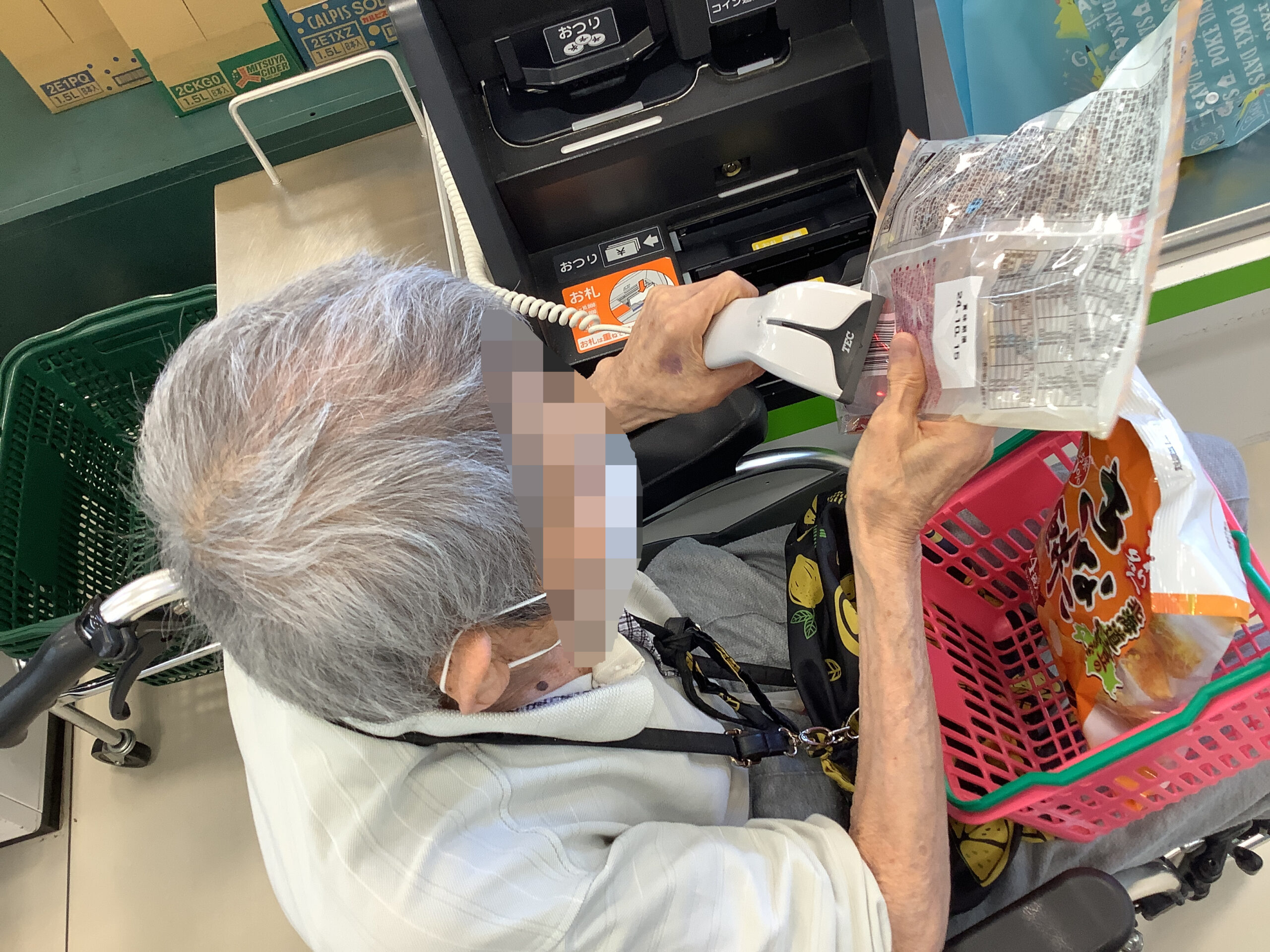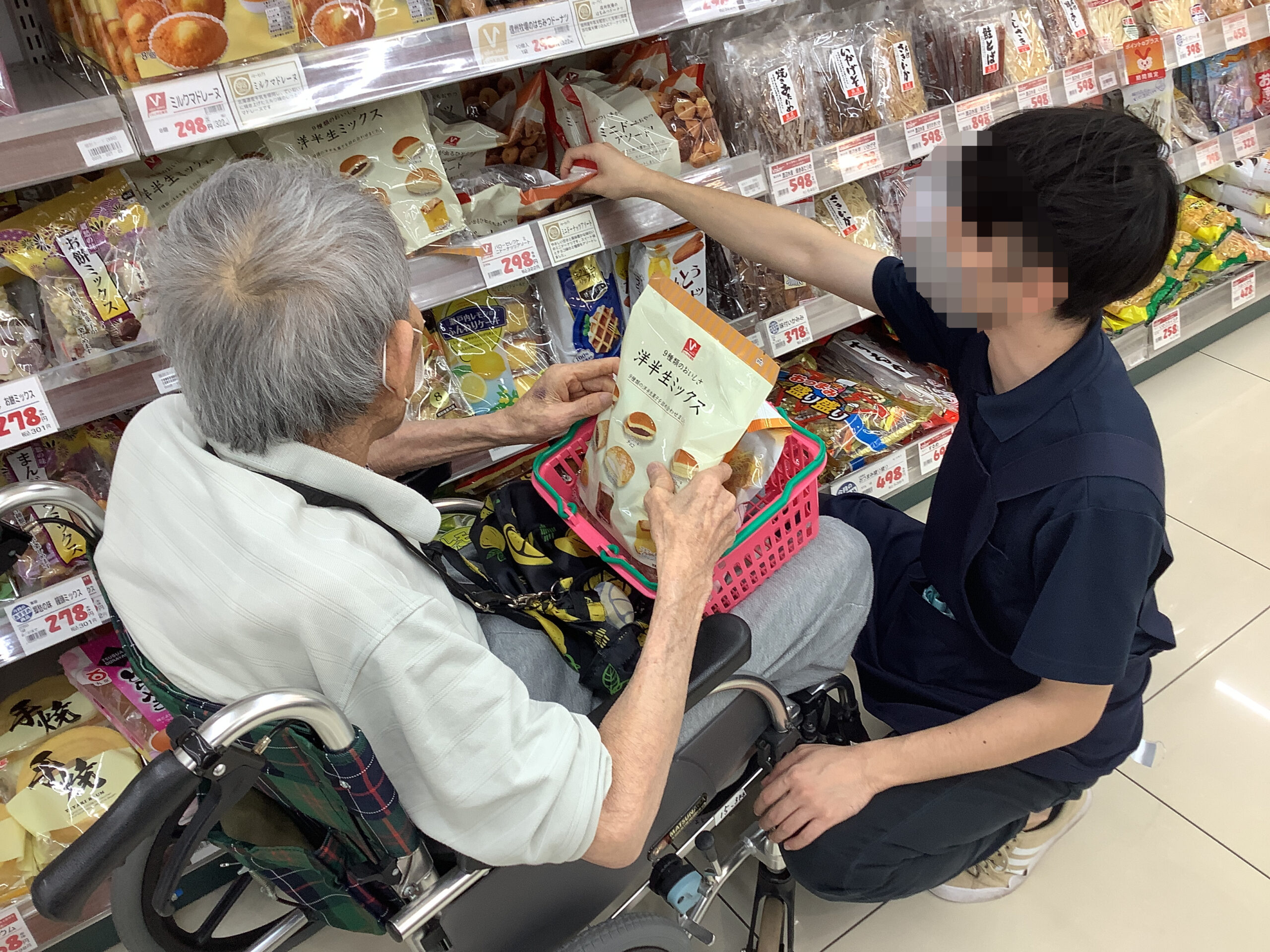 利用者様の1人も一緒に行ってお菓子のお買い物を楽しんでいただきました。いつもは娘様からの差し入れか、「とくし丸」で買っておられる方です。広い売り場でお好きなお菓子を選んでいただき、まだ空いている時間だったのでセルフレジも体験していただきました。