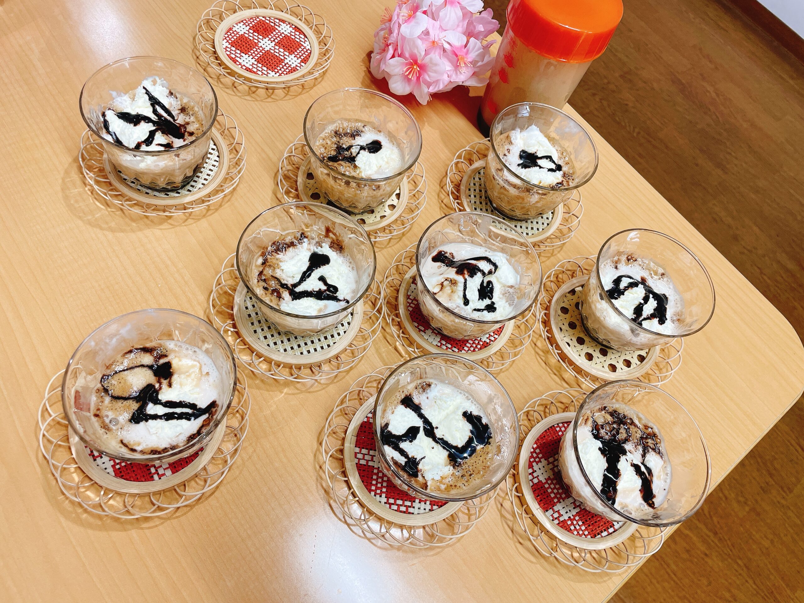 今日はお昼休みに「何かしたい!」とリビングに来た入居者様と思い付きでダルゴナコーヒーを作りました。容器にコーヒーと砂糖、お湯を少し入れ振り振り。「こんなことしたの初めて」と笑顔で作ってくれました。冷たい牛乳の上にかけてアイスもチョコソースもトッピングしました。♪可愛くできて大満足な時間となりました。♪