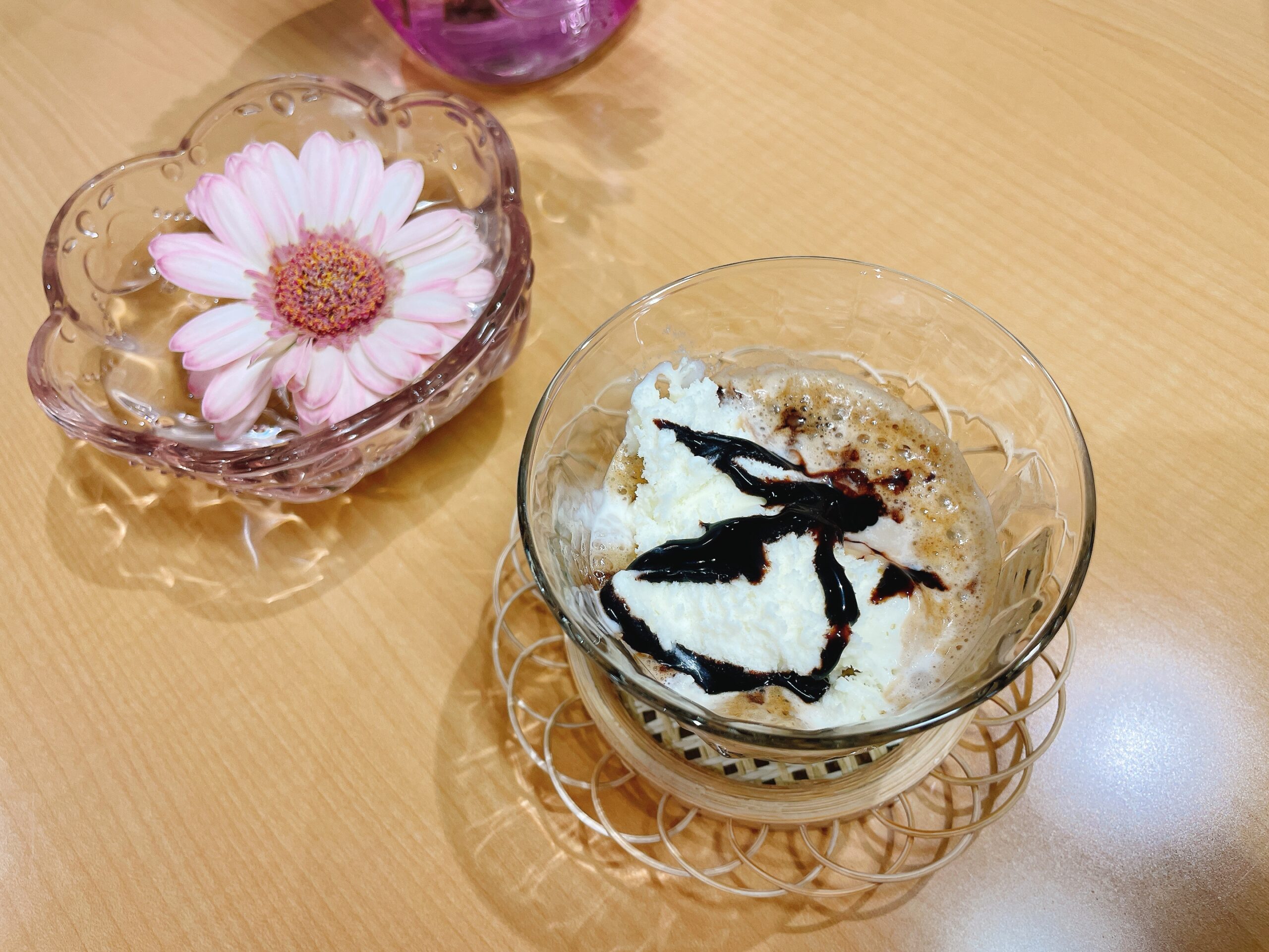 今日はお昼休みに「何かしたい!」とリビングに来た入居者様と思い付きでダルゴナコーヒーを作りました。容器にコーヒーと砂糖、お湯を少し入れ振り振り。「こんなことしたの初めて」と笑顔で作ってくれました。冷たい牛乳の上にかけてアイスもチョコソースもトッピングしました。♪可愛くできて大満足な時間となりました。♪