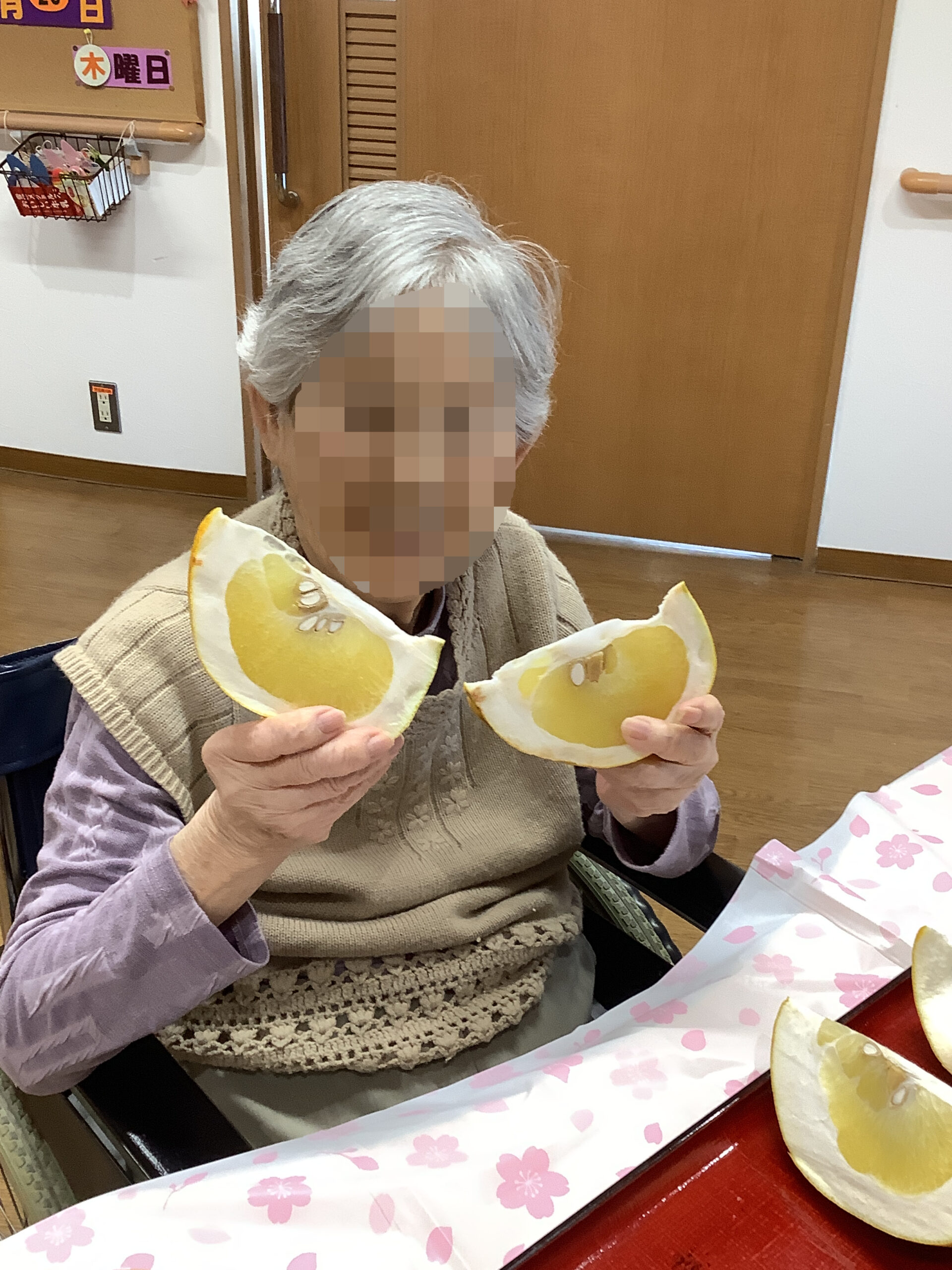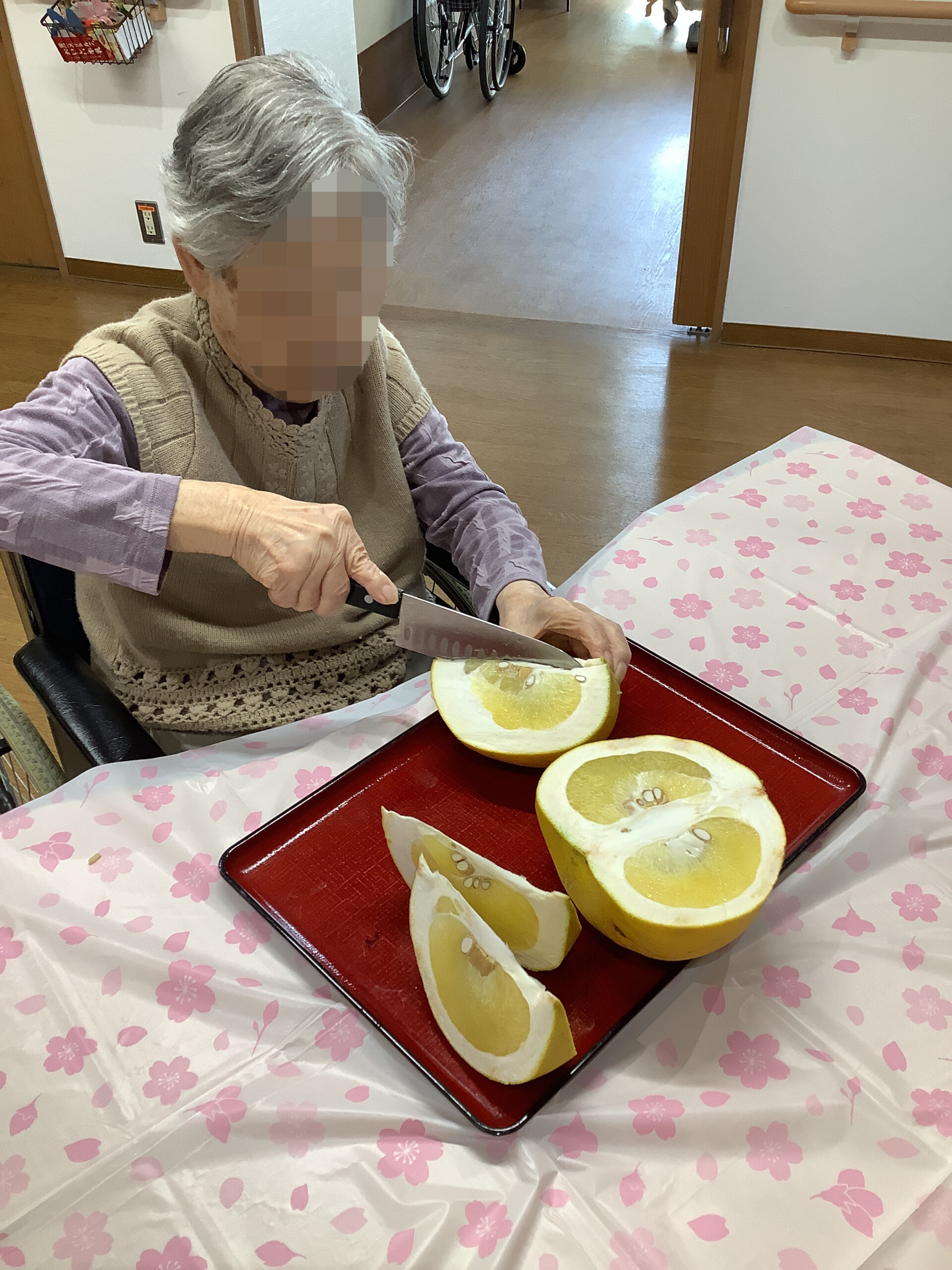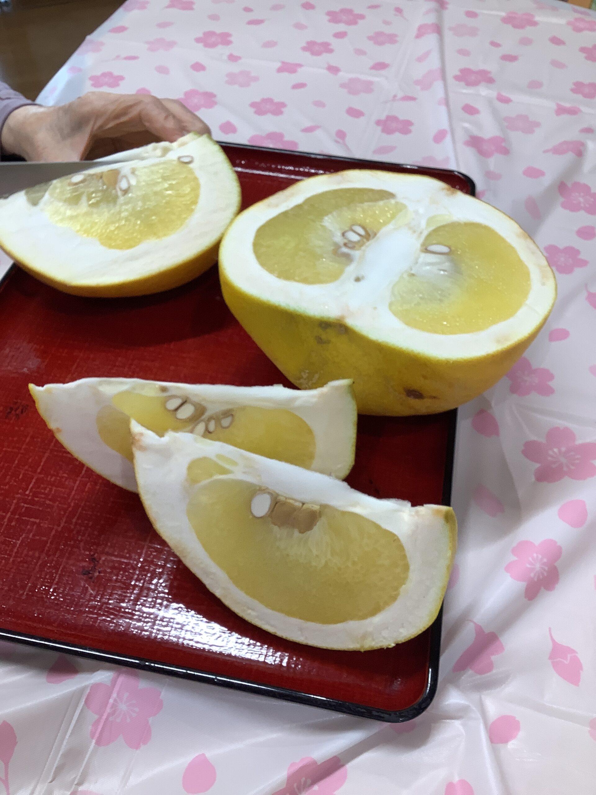 大きな晩白柚をお持ちすると、「わあ、大きいね」と驚きの声が上がりました。顔と同じくらいのサイズがあり、両手で抱えるほどの立派な実です。包丁を入れると、爽やかな香りが広がり、自然と笑顔がこぼれました。