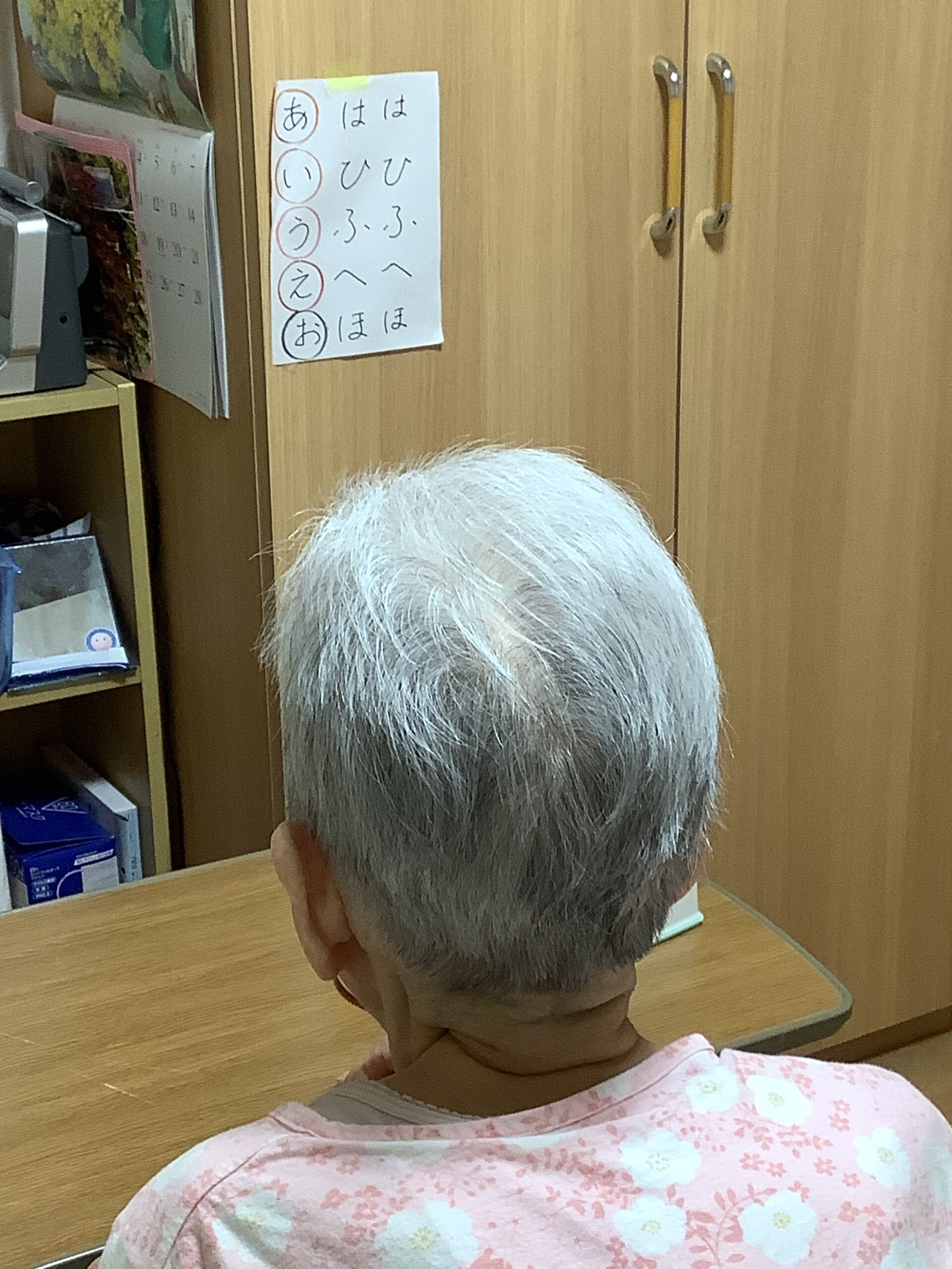 それに加えて、壁の手すりを使った足腰の運動や、壁に貼ったひらがな表を見ながらのお口の体操にも取り組まれています。こうした運動は、入居者様ご自身が自主的に行われている姿も多く見られ、日々の積み重ねの大切さを感じます。