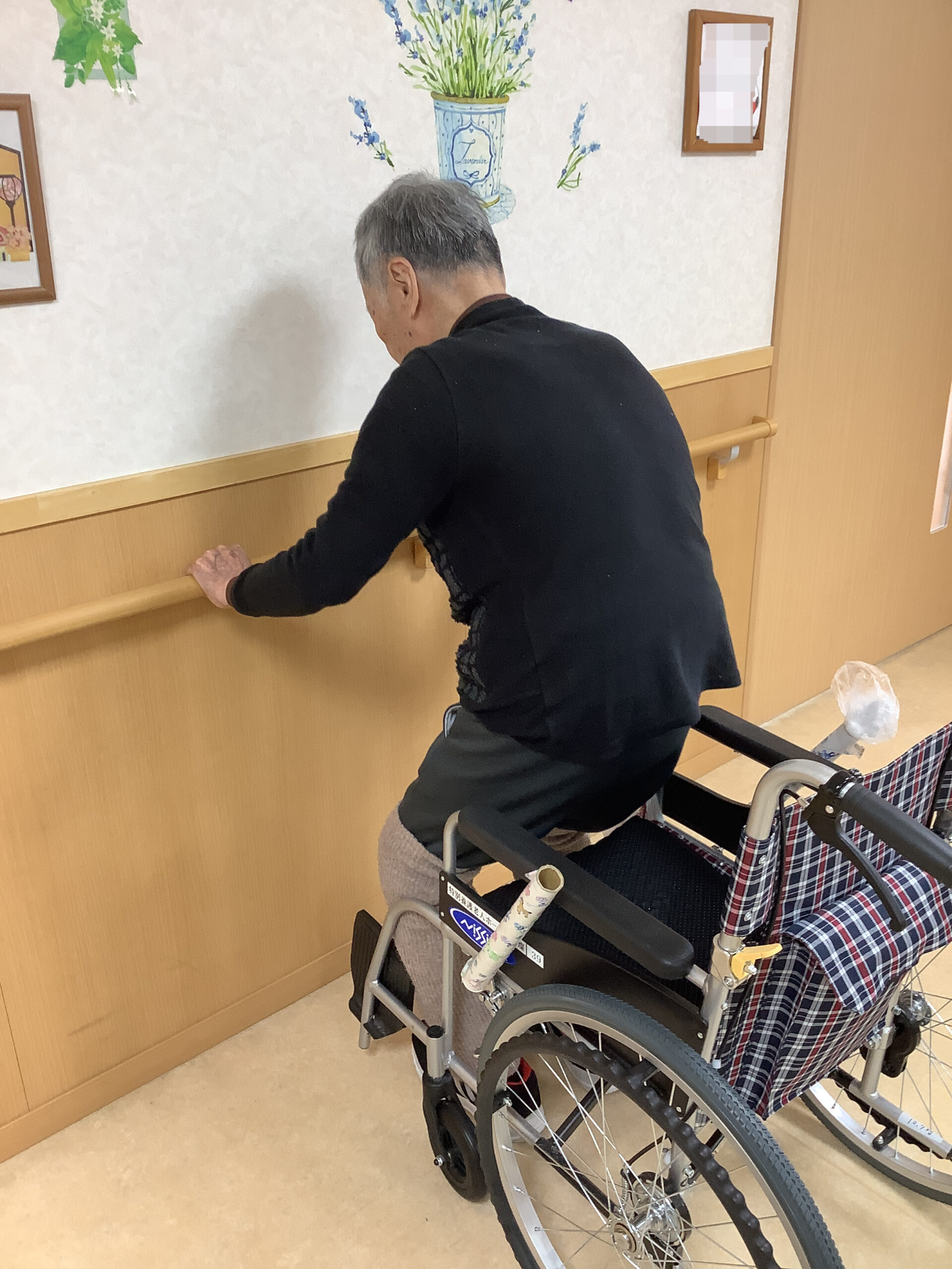 それに加えて、壁の手すりを使った足腰の運動や、壁に貼ったひらがな表を見ながらのお口の体操にも取り組まれています。こうした運動は、入居者様ご自身が自主的に行われている姿も多く見られ、日々の積み重ねの大切さを感じます。